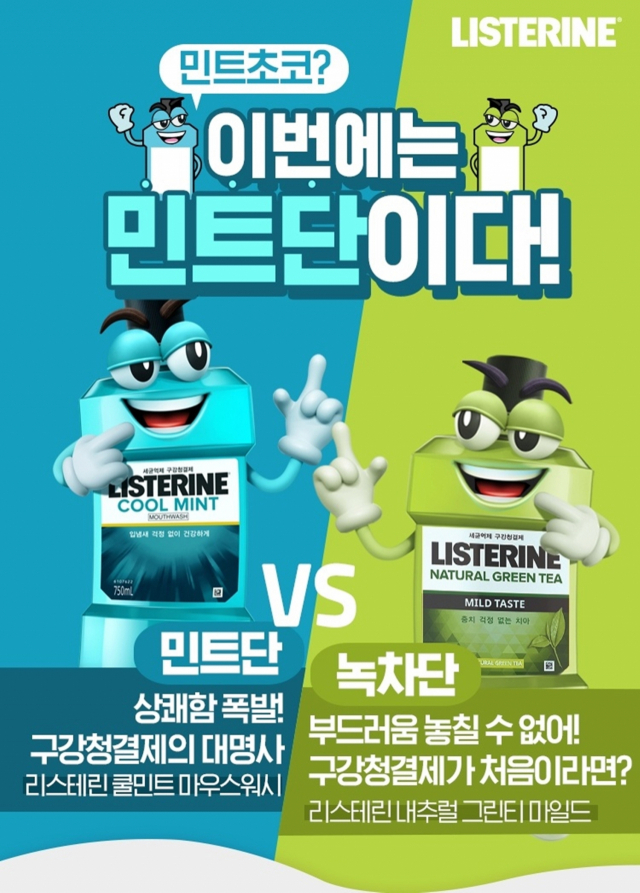 한국존슨앤드존슨의 구강청결제 브랜드 '리스테린'이 'MZ세대'를 중심으로 유행하고 있는 '민초vs반민초' 트렌드에 맞춰 자사 '쿨민트 마우스워시' 제품과 '내추럴 그린티 마일드' 제품의 대결 구도를 통한 SNS 이벤트(사진)와 고객 대상 올리브영 구매 혜택을 마련했다고 29일 밝혔다.