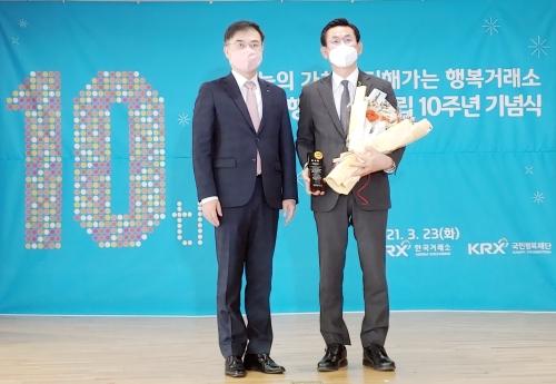 동아대병원(원장 안희배·오른쪽)이 최근 부산국제금융센터(BIFC) 한국거래소 본사에서 개최된 한국거래소 KRX국민행복재단(이사장 송병두) 창립 10주년 기념식에서 국내 저소득 계층의 보건의료 향상과 해외 저개발국 주민들의 의료 봉사 활동에 노력한 공로로 감사패를 수상했다. 임원철 선임기자