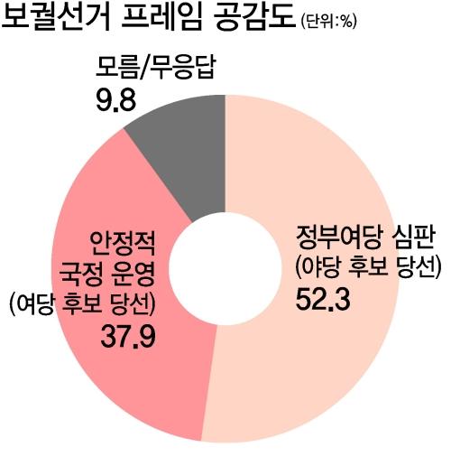 <부산일보>와 YTN이 공동으로 리얼미터에 의뢰해 지난 28~29일 18세 이상 부산시민 1012명을 대상으로 진행한 4차 여론조사에서 응답자 절반이 넘는 52.3%가 정부·여당 심판론에 공감했다. 반면 안정적인 국정 운영을 위해 여당 후보가 당선돼야 한다는 비율은 37.9%로 14.4%포인트(P) 낮은 것으로 확인됐다.