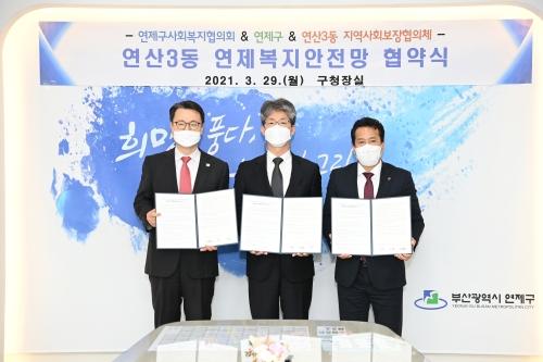 부산 연제구청(구청장 이성문)은 최근 구청장실에서 연산3동 지역사회보장협의체의 활동을 제도적으로 지원하는 연제복지안전망 협약식을 했다.