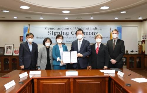 동서대학교(총장 장제국·왼쪽 네 번째)는 지난달 26일 대학 뉴밀레니엄관에서 인도 힌두스탄공과대학교(HITS)와 상호 교류를 위한 협정식을 체결했다.
