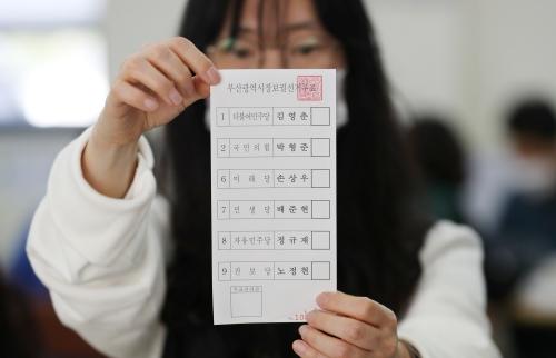 31일 부산시 연제구선거관리위원회 투표용지 검수작업장에서 한 직원이 4·7 부산시장 보궐선거 투표용지를 들어보이고 있다. 강선배 기자 ksun@