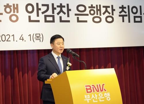 BNK부산은행 13대 은행장인 안감찬 신임 은행장이 1일 취임과 함께 본격적으로 업무에 돌입했다. 안 행장의 취임식은 1일 오전 은행 본점 23층에서 열렸다.