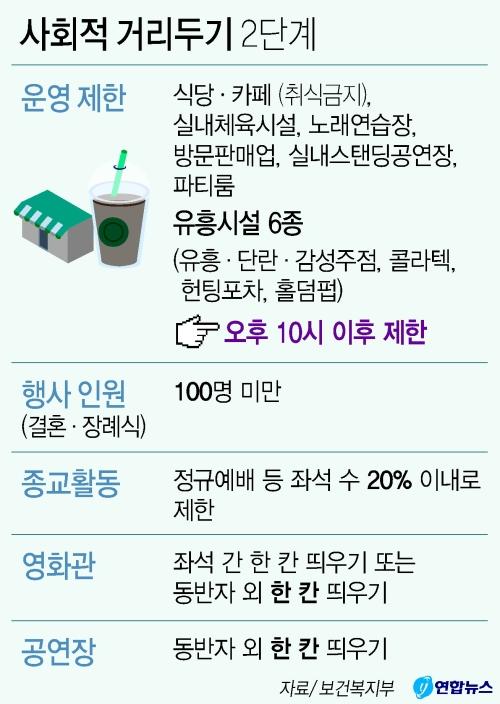 1일 부산시 등에 따르면 거리 두기 2단계 격상에서 핵심은 영업시간 제한이다. 식당·카페, 실내체육시설, 목욕장업, 유흥 5종(유흥·단란·감성주점, 콜라텍, 헌팅포차)과 홀덤펍 등은 오후 10시부터 오전 5시까지 영업이 금지된다. 단 식당과 카페, 포장마차는 해당 시간에 배달이나 포장판매가 가능하다.