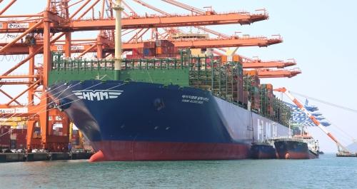 세계 최대 컨테이너선인 HMM 알헤시라스(2만 4000TEU급)호가 지난해 4월 부산항 신항에 처음 입항해 컨테이너를 선적하고 있다.