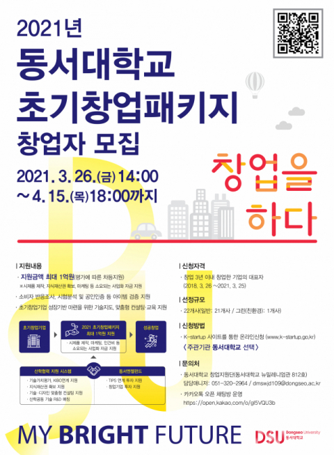 동서대(총장 장제국)는 유망 창업아이템 및 고급기술을 보유한 지역의 우수한 창업자를 발굴하고 창업활동을 지원하기 위해 ‘2021년 초기창업패키지’ 초기창업기업을 4월 15일까지 모집한다고 밝혔다.