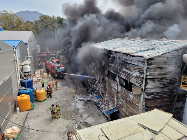 불은 인근 공장 2곳으로 옮겨 붙었으나, 소방당국이 인력 80여 명과 헬기 등을 투입해 오후 2시 20분 초기 진화에 성공했다.