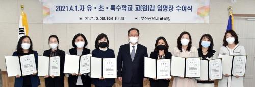 김석준(가운데) 부산광역시교육감이 지난달 30일 시교육청 별관에서 4월 1일자로 승진 발령난 공립 유·초·중등(특수)학교 교감 15명에게 임명장을 수여했다.