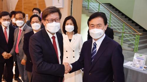 ‘2021 부산 부활절 연합 예배’가 열린 4일 오후 부산 북구 포도원교회를 방문한 더불어민주당 김영춘(오른쪽) 후보와 국민의힘 박형준 후보가 악수하고 있다. 강선배 기자 ksun@4·7 부산시장 보궐선거 막판까지 후보 간 폭로·비방전이 과열되고 있다. 정책과 비전 경쟁은 설 자리를 잃은 채 양강 후보 측이 상대 당과 후보 흠집 내기에만 열을 올리면서 선거일이 임박할수록 ‘진흙탕 공방’만 확대재생산되는 형국이다.