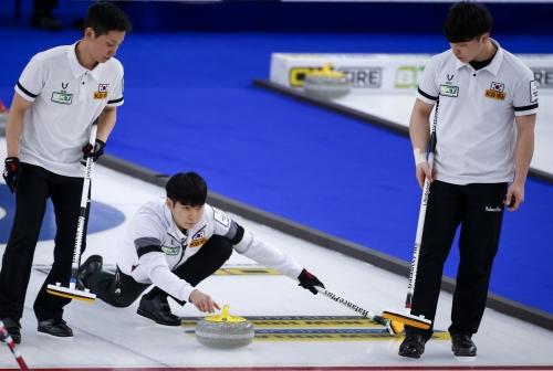 4일(한국시간) 캐나다 앨버타주 캘거리에서 열린 2021 세계남자컬링선수권대회 3차전 노르웨이와 경기에서 한국 대표팀 스킵 정영석(오른쪽)이 샷을 하고 있다. 한국은 노르웨이에 2-9로 져 3패를 기록했다. AP연합뉴스