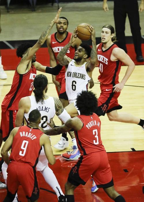 5일(한국시간) 미국 텍사스주 휴스턴에서 열린 휴스턴 로케츠와 뉴올리언스 펠리컨스의 프로농구(NBA) 경기에서 뉴올리언스 6번 니케일 알렉산더(가운데)가 상대 밀집 수비를 뚫고 공격을 시도하고 있다. AFP연합뉴스