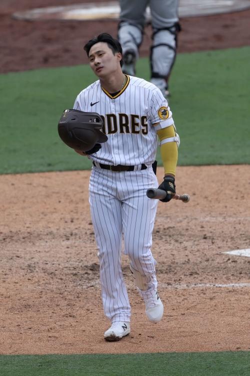미국 메이저리그(MLB) 샌디에이고 파드리스의 김하성. AFP연합뉴스미국 프로야구 메이저리그(MLB) 샌디에이고 파드리스의 김하성이 대타로 나와 내야 땅볼로 물러났다.