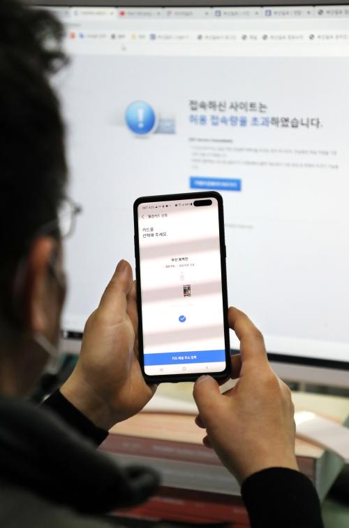 5일 한 시민이 동백전 앱을 이용해 선불카드를 발급받고 있다. 이재찬 기자 chan@가입자만 90만 명이 넘는 부산 지역화폐인 동백전 서비스가 5일 재개됐다. 그러나 기존 동백전 카드를 가진 가입자들도 새 선불카드를 발급받지 않으면 동백전 서비스를 아예 이용할 수 없어 강한 불만이 제기되고 있다.