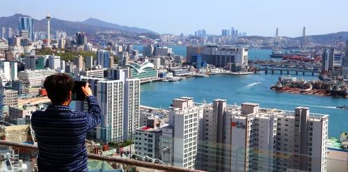 청명한 날씨를 보인 5일 부산 서구 남부민동 산복도로에서 바라본 부산 도심이 해운대의 초고층 건물이 선명하게 보일 정도로 깨끗한 모습을 보이고 있다. 오른쪽은 황사 경보가 발령된 지난달 29일 도심 모습. 강선배 기자 ksun@