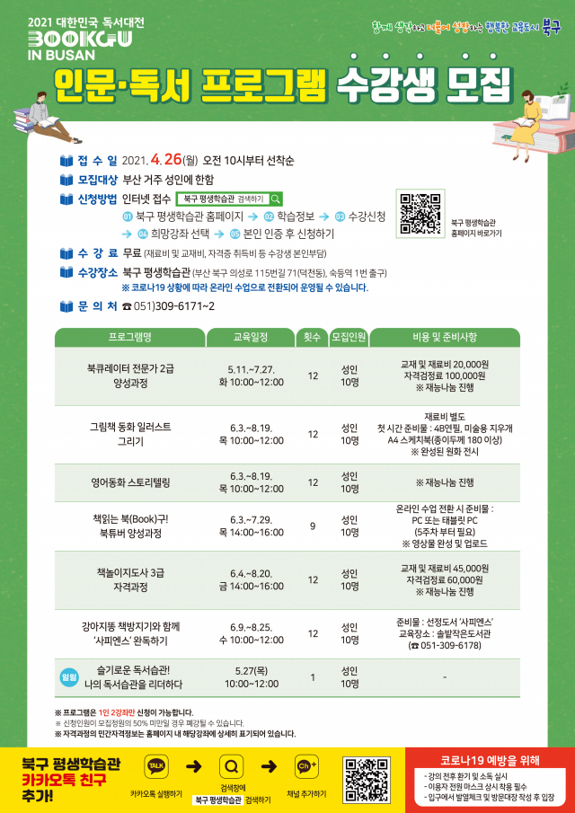 부산 북구(정명희 구청장)는 ‘2021 대한민국 독서대전’ 개최를 앞두고 부산시민을 대상으로 ‘책맥 저자 북콘서트’ 및 ‘인문·독서 프로그램’을 운영한다고 7일 밝혔다.