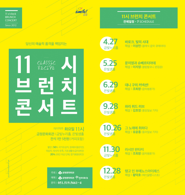 정미영 금정구청장은 “코로나19 여파로 문화계가 많이 위축됐다”며 “2021년을 맞이해 더욱 풍성해진 ‘11시 브런치 콘서트’를 통해 관객도 연주자도 음악 감수성을 가득 채우게 되길 바란다”고 전했다.