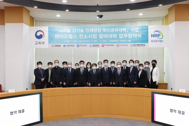 부산가톨릭대(총장 신호철 신부)가 교육부 주관 ‘디지털 신기술 인재양성 혁신공유대학’(이하 혁신공유대학) 사업 지원을 위해 6개 대학과 함께 바이오헬스 컨소시엄을 구성 및 컨소시엄 업무협약을 체결했다.