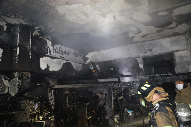 12일 불이 난 진주시 본성동 상가주택 3층 내부에서 소방대원들이 진화와 수색을 하고 있다. 경남소방본부 제공