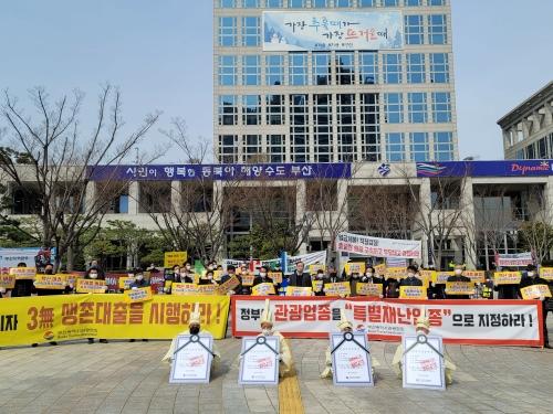 부산관광협회가 지난달 9일 특별재난업종 지정 등을 요구하며 부산시청 앞에서 집회를 열었다. 부산관광협회 제공코로나19 사태로 직격탄을 맞아 ‘임시 휴업’ 중인 부산 여행업계가 생존을 위해 몸부림치고 있다.