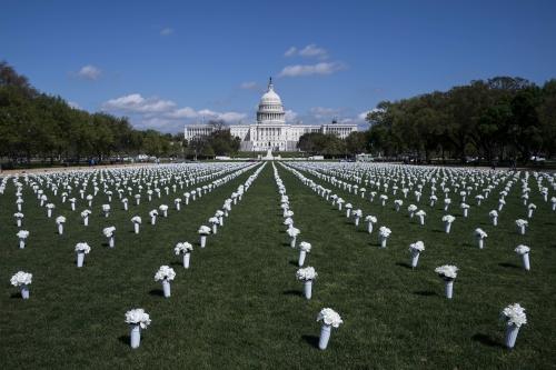 13일(현지시간) 미국 워싱턴DC 내셔널 몰 잔디밭에 총기 규제를 주장하는 단체 ‘기퍼즈’(Giffords)가 총기 폭력 희생자들을 위해 마련한 4만 송이의 추모 조화를 방문객들이 관람하고 있다. 조화 4만 송이는 매년 총기 폭력으로 사망하는 미국인 4만 명을 의미한다. UPI연합뉴스