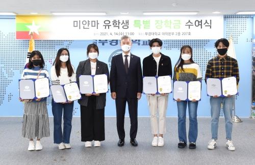 국립부경대학교(총장 장영수·가운데)는 지난 14일 대학본부 회의실에서 미얀마 유학생을 위한 특별 장학금 수여식을 하고, 유학생들에게 1학기 학비 전액과 별도의 생활비를 전달했다.