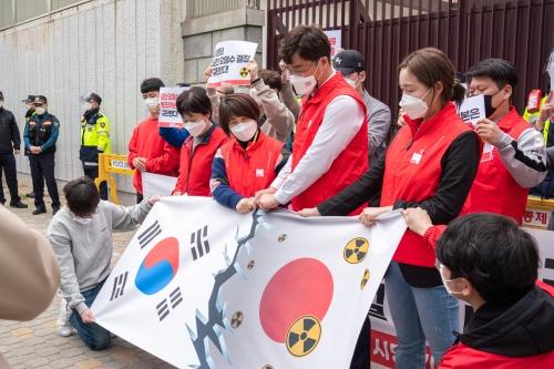 진보당 부산시당이 15일 부산 동구 초량동 일본총영사관 앞에서 ‘후쿠시마 원전 오염수 방류 결정 규탄’ 퍼포먼스를 벌이고 있다. 진보당 부산시당 제공