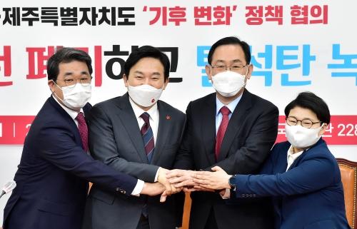국민의힘 의원들과 원희룡(왼쪽에서 두 번째) 제주지사가 15일 국회에서 열린 국민의힘-제주특별자치도 기후 변화 정책 협의에서 기념촬영을 하고 있다. 김종호 기자