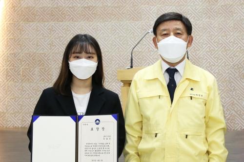 동의대학교(총장 한수환) 국제관광경영학전공 4학년 김호은(왼쪽) 씨가 최근 김해시청(시장 허성곤·오른쪽)에서 ‘김해시 우수자원봉사왕 표창장’을 받았다.