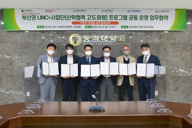 동의대를 비롯한 부산권 6개 대학 LINC+사업단은 지난 4월 16일 오후 3시 30분 동의대 본관 2층 회의실에서 2021학년도 LINC+사업으로 추진할 협력 프로그램의 공동운영을 위한 업무 협약식을 개최했다.
