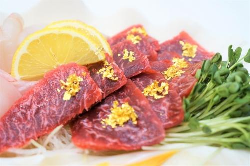 이어지는 음식은 모둠 참치다. 배꼽살과 뱃살, 볼살이다. 광어회도 들어 있다. 금가루가 뿌려진 볼살은 기름장에 찍어 먹는다. 참치의 느끼한 맛이 덜하고 마치 소고기육회 같은 느낌을 준다. 하얀 지방 속에 불그스레한 살 부위가 박혀 있는 배꼽살은 고소하면서 풍성한 분위기를 주는 맛이다. 마블링이 잘 된 소고기 같은 느낌을 주는 뱃살은 달콤하고 부드럽다. 배꼽살과 뱃살은 기름기가 많기 때문에 생겨자를 듬뿍 얹어 간장에 찍어먹는 게 훨씬 좋다.