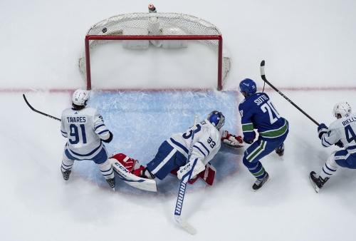 21일(한국시간) 캐나다 밴쿠버에서 열린 밴쿠버 캐넉스와 토론토 메이플 리프스의 북미아이스하키(NHL) 경기에서 밴쿠버 소속 브랜든 서터(오른쪽)가 득점한 가운데 토론토 선수들이 골대로 들어가는 퍽을 바라보고 있다. AP연합뉴스