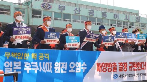 21일 오전 부산 서구 남부민동 부산공동어시장에서 열린 ‘일본 원전 오염수 해양방출 규탄 기자회견’에서 대형기선저인망수협 소속 어업인들이 원전 오염수 해양방출 결정 철회와 일본 수산물 수입 금지, 국내 수산물 소비 위축 대책 마련 등을 촉구하고 있다. 정종회 기자 jjh@