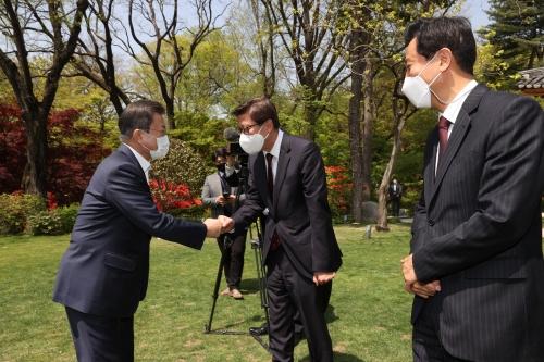 문재인(왼쪽) 대통령이 21일 청와대 상춘재에서 박형준(가운데) 부산시장, 오세훈 서울시장과의 오찬 간담회에 앞서 인사하고 있다. 연합뉴스문재인 대통령은 21일 가덕신공항 건설, 2030 엑스포 유치 등 부산지역 현안에 대한 박형준 부산시장의 지원요청에 적극적으로 협력하겠다는 뜻을 밝혔다.
