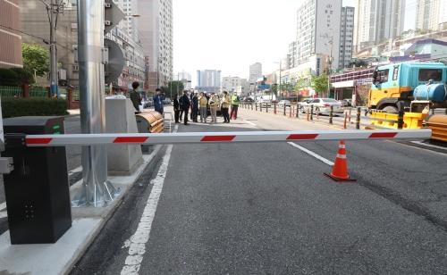 21일 부산 부산진구 범천지하차도에 집중호우 때 차량의 진입을 막는 진입차단시설 설치공사가 완공돼 종합시운전이 실시됐다. 이번에 설치된 시설은 집중호우 시 경고시설(경광등, 사이렌, 전광판)과 차단시설이 자동으로 작동해 진입차량을 신속히 차단한다. 정대현 기자 jhyun@