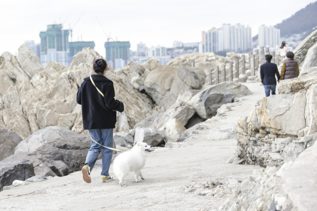 봄철 미세먼지가 반려견들의 건강을 위협하고 있다. 사진은 시민들이 반려견과 함께 영도 흰여울길을 걷는 모습. 부산일보DB