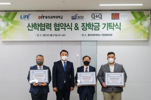 동의과학대학교(총장 김영도·왼쪽 두 번째)가 최근 대학 석당문화관에서 미래융합학부 교육과정 개발과 취업 지원 강화를 위해 (주)큐엔큐(대표 박상현), 국성폴리텍(주)(대표 정연우), (주)진프라텔로(대표 이광진) 등 3개 기관과 산학협력 협약을 체결했다.