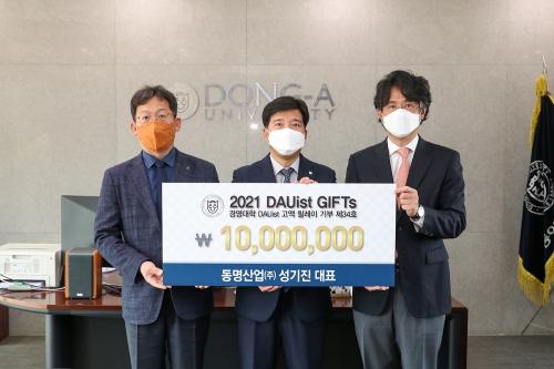 성기진(왼쪽·동아대 기계공학과 85학번) 동명산업(주) 대표가 최근 동아대학교(총장 이해우·가운데) 경영대학 발전과 교육 혁신을 위해 1000만 원을 기부했다.
