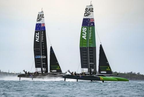 피터 벌링이 이끄는 뉴질랜드 팀(왼쪽)과 톰 스링스비가 이끄는 오스트리아 팀이 25일 북대서양 버뮤다 해밀턴에서 열린 버뮤다 요트 그랑프리 레이싱 대회 2일차 경기에서 기량을 겨루고 있다. AP연합뉴스
