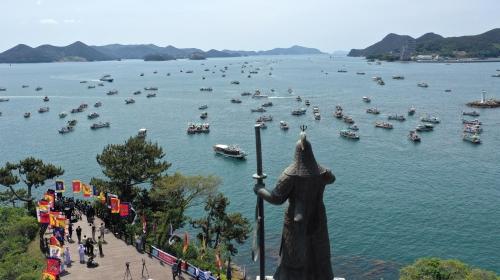통영지역 어업인이 26일 경남 통영시 정량동 이순신공원 앞 해상에서 ‘후쿠시마 원전 오염수 방류 규탄 통영대회’를 열고 일본 정부를 규탄하고 있다. 연합뉴스