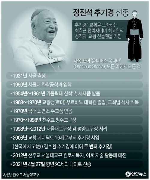 27일 90세로 선종한 천주교 전 서울대교구장 정진석(1931~2021) 추기경은 1970년 39세 때 청주교구장이 된 최연소 주교였으며, 2006년 고 김수환 추기경에 이어 임명된 두 번째 한국인 추기경이었다.