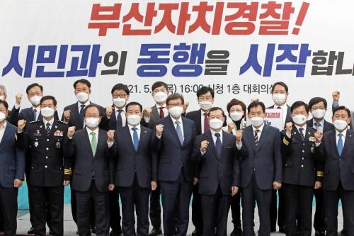 부산형 자치경찰제도를 이끌 초대 부산자치경찰위원회 출범식이 6일 부산시청 대회의실에서 열렸다. 이날 공식 출범하는 자치경찰위원회는 부산형 자치경찰분야 정책수립과 추진 등을 총괄하게 된다. 김경현 기자 view@