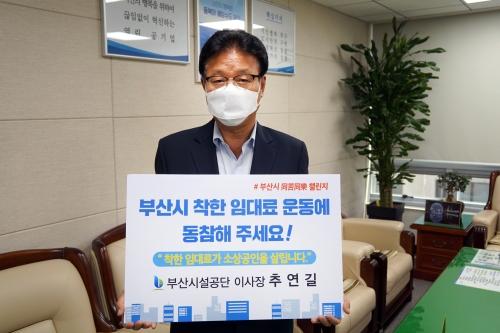 부산시설공단 추연길 이사장은 지난 3일 코로나19로 어려움을 겪고 있는 소상공인의 임대료 부담을 경감하기 위해 시작된 부산시 ‘동고동락 챌린지’ 캠페인에 동참했다고 밝혔다. 임원철 선임기자