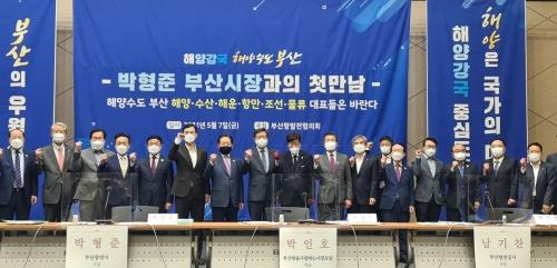 부산 해양수산업계 대표들이 지난 7일 부산항국제전시컨벤션센터에서 박형준 부산시장과 첫 정책간담회를 열었다. 이날 행사 참가자들은 부산항 종사자들에 대한 코로나19 백신 우선 접종, ‘2022 국제물류협회 부산 총회’ 개최 지원 등의 건의사항을 전달했다. 부산항발전협의회 제공