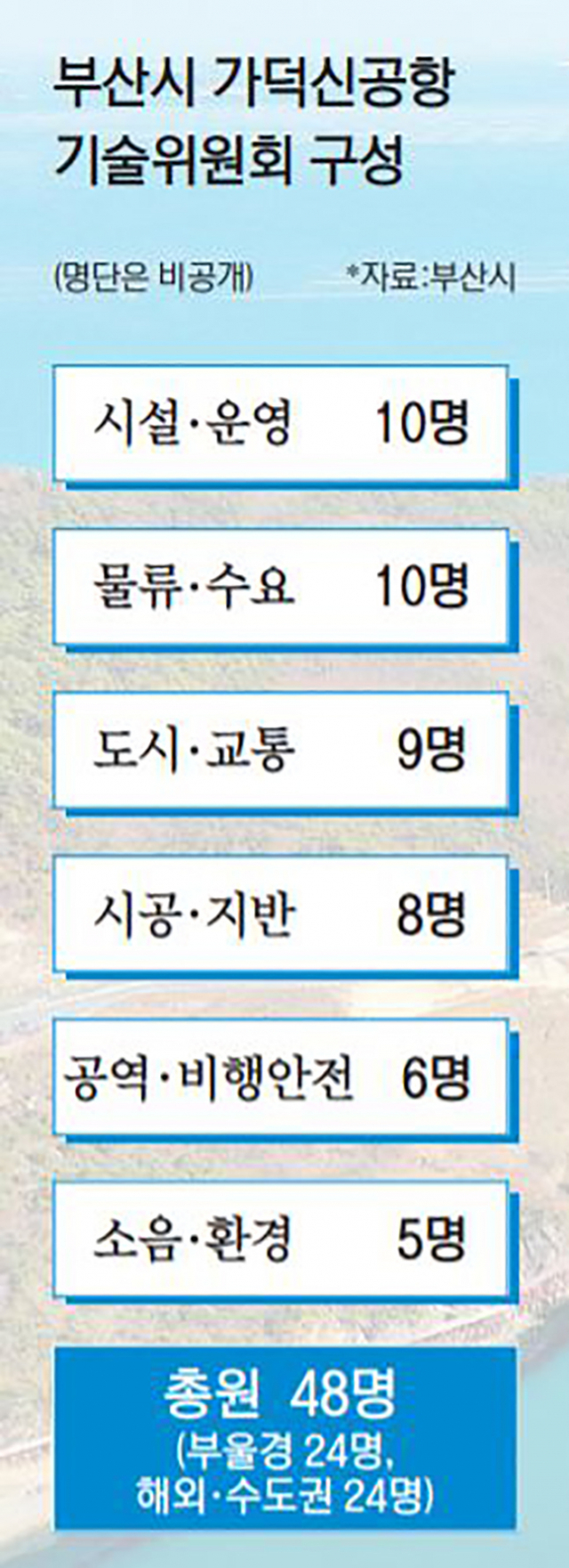 부산시는 기술위원회의 균형 잡힌 시각을 유지하는 차원에서 해외·수도권 전문가 24명과 부울경 전문가 24명으로 구성했다. 출신별로 보면 대학교수 29명, 연구기관 9명, 설계사 4명, 시공사 3명, 항공사·시공사 관계자 3명 등이다. 전문성과 공정성을 확보하기 위해 위원 명단은 공개하지 않기로 했다.