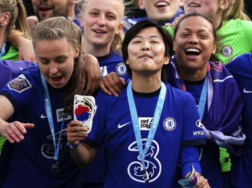 10일 영국 런던의 킹스 메도우에서 열린 잉글랜드 여자 슈퍼리그(WSL) 첼시 위민과 레딩 위민의 경기 후 첼시의 지소연(가운데)이 동료들과 함께 우승을 자축하고 있다. AP연합뉴스한국 여자축구의 ‘에이스’ 지소연이 뛰는 첼시 위민이 2년 연속 잉글랜드 여자 슈퍼리그(WSL) 우승컵을 들어 올렸다.