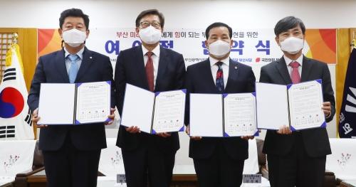 10일 오전 부산시청 7층 국제의전실에서 부산시정 실현을 위한 여야정 협약식이 열렸다. 왼쪽부터 박재호 더불어민주당 부산시당위원장, 박형준 부산시장, 신상해 부산시의회 의장, 하태경 국민의힘 부산시당위원장. 정종회 기자 jjh@‘성숙한 민주주의와 공정한 사회를 위한 노무현 대통령의 뜻을 이어가겠습니다.’