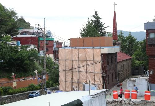 10일 부산 서구 아미동 은천교회 건물 바깥에 건물 철거를 위한 비계와 방진망이 설치돼 있다. 정대현 기자 jhyun@한국전쟁 당시 ‘피란민의 성지’로 일컬어지던 부산 서구 아미동 은천교회가 결국 67년 역사의 막을 내리게 됐다.