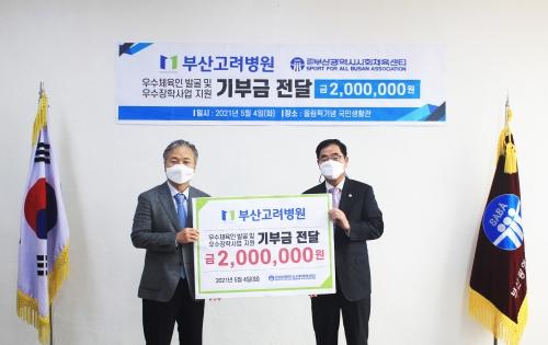 부산고려병원(이사장 김철)은 최근 우수체육인 발굴과 육성장학사업 지원을 위해 부산광역시사회체육센터(이사장 배영호)에 기부금 200만 원을 전달했다.