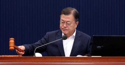 문재인 대통령이 11일 오전 청와대 여민관에서 열린 제20회 국무회의에서 의사봉을 두드리고 있다. 연합뉴스국무총리 후보자 인준안과 장관 후보자 인사청문보고서 채택 문제를 놓고 여야가 한 치의 양보도 없는 가운데 대립이 장기화되고 있다. 문재인 대통령은 11일 임혜숙 과학기술정보통신부·박준영 해양수산부·노형욱 국토교통부 장관 후보자에 대한 인사청문경과보고서를 14일까지 재송부해 달라고 국회에 요청해 청문정국이 더욱 복잡하게 얽히고 있다.