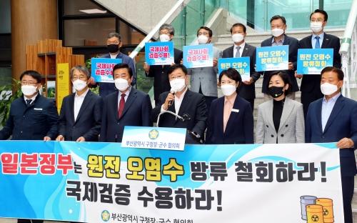 부산시 구청장·군수 협의회 소속 구청장과 군수가 11일 오전 금정구청에서 일본의 후쿠시마 원전 오염수 방류 결정 철회를 요구하는 성명서를 발표하고 오염수 처리과정에 대한 국제사회의 검증 수용을 촉구하고 있다. 정종회 기자 jjh@